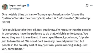 Pretty interesting. The President, known for impatience and impulsivity, suggesting he’s one with more tolerance for seeing this war to the end. Whether we’re now closer to escalation or an ending is today’s poll question. What might an escalation look like? Probably one of three options: Taking Kharg Island; freeing the Strait of Hormuz or seizing the enriched uranium. But Marco Rubio posted 4 objectives via State Department social media. Rubio says the objectives are clear: “destroy their air force, navy, missile factories, and degrade their missile launchers.” But notice what’s missing: nukes and protecting the Iranian protestors, not to mention the Strait of Hormuz.